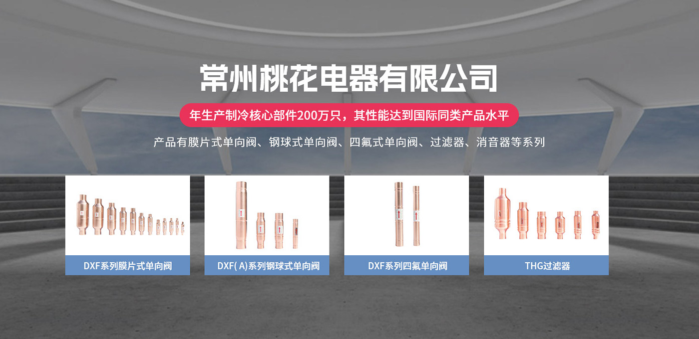 常州桃花電器有限公司地處中國長江“金三角”之稱的上海至南京高速公路、城際高鐵、常州高新經濟技術開發區路段,交通便利、技術力量十分雄厚。它是集研究、開發設計、制造和經營制冷核心部件的企業,主要生產中央空調上使用的制冷部件。產品有膜片式單向閥、鋼球式單向閥、四氟式單向閥、過濾器、消音器等系列。年生產制冷核心部件200萬只,其性能達到國際同類產品水平。  企業擁有先進的科學技術、國際先進的生產加工設備和精密的檢測儀器,并已通過ISO9001質量體系及CE認證,公司歷史悠久,2000年起,經過長期積累、沉淀,經驗豐富,從而保證了產品的高質量、高性能、高耐用性。企業產品在國內外市場具有較高的知名度,深受眾多中外品牌制冷客商的好評。主要客戶有約克、麥克維爾、美的、開利、特靈、頓漢布什、清華同方、天加等.并出口北美、歐洲、東南亞等地區。  高品質產品是企業的保證,周到服務是合作友誼的承諾,企業本著“求